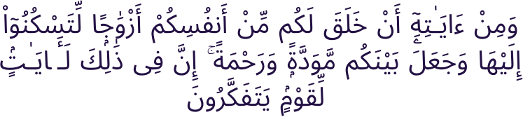 “And one of His signs is that he created for you spouses from among yourselves, so that you may find comfort in them. And He has placed between you and mercy. Surely in this are signs for people who reflect.”
